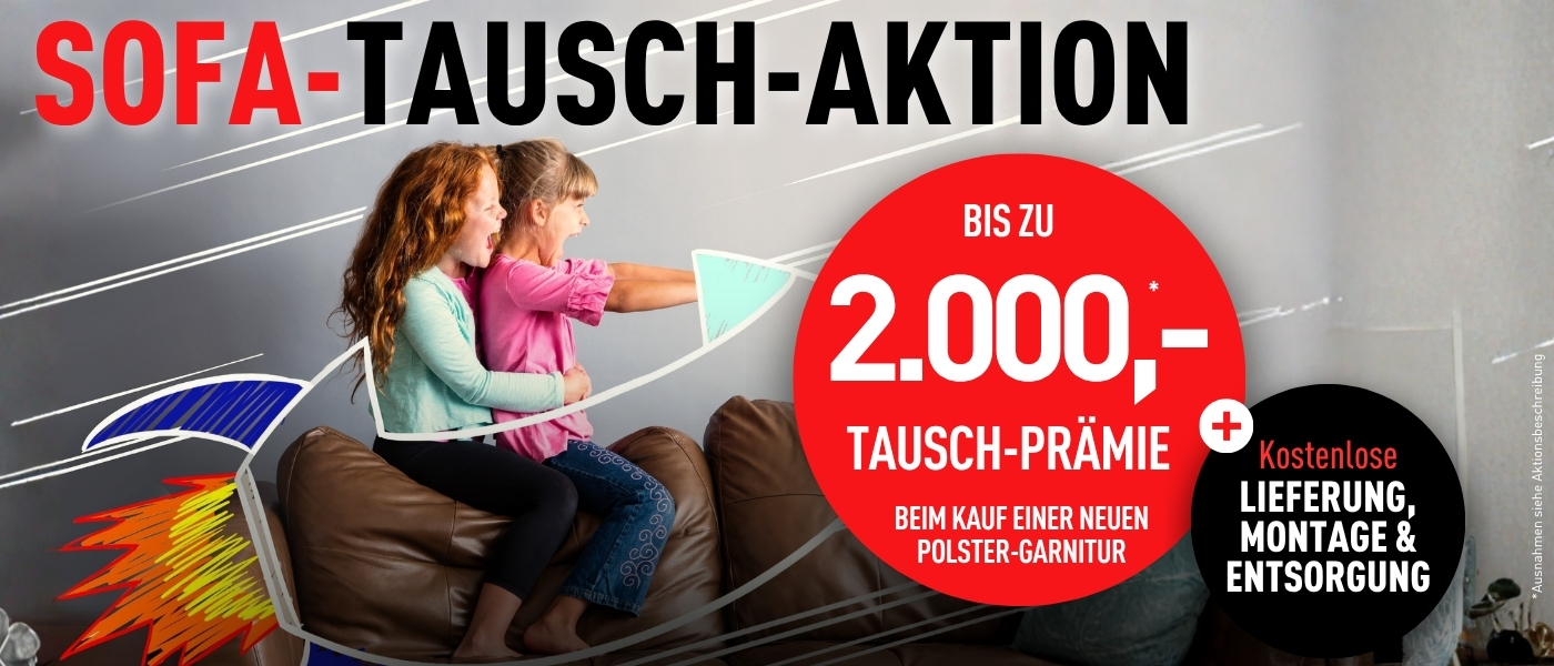 Vom 08.04. bis 22.04.2026 habt ihr die Chance, euch beim Kauf eines neuen Sofas bis zu 2000,- Tausch-Prämie* zu sichern. Außerdem bieten wir euch eine kostenlose Lieferung, Montage & Entsorgung eurer alten Garnitur*!